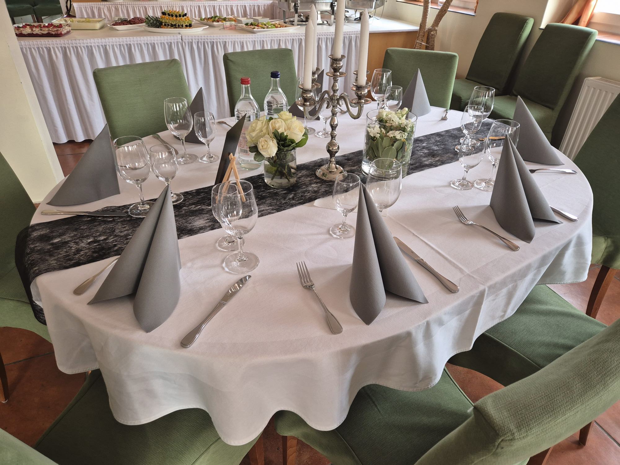Für das Buffet stehen Tische in U-Form bereit. Geschirr und Besteck sind ebenfalls vorhanden.