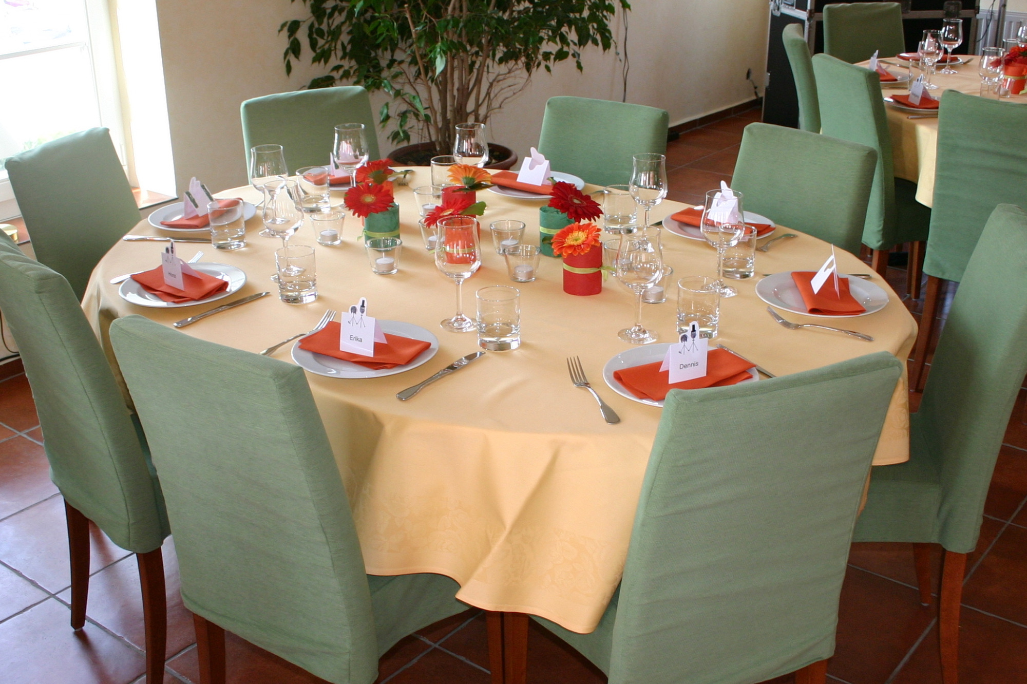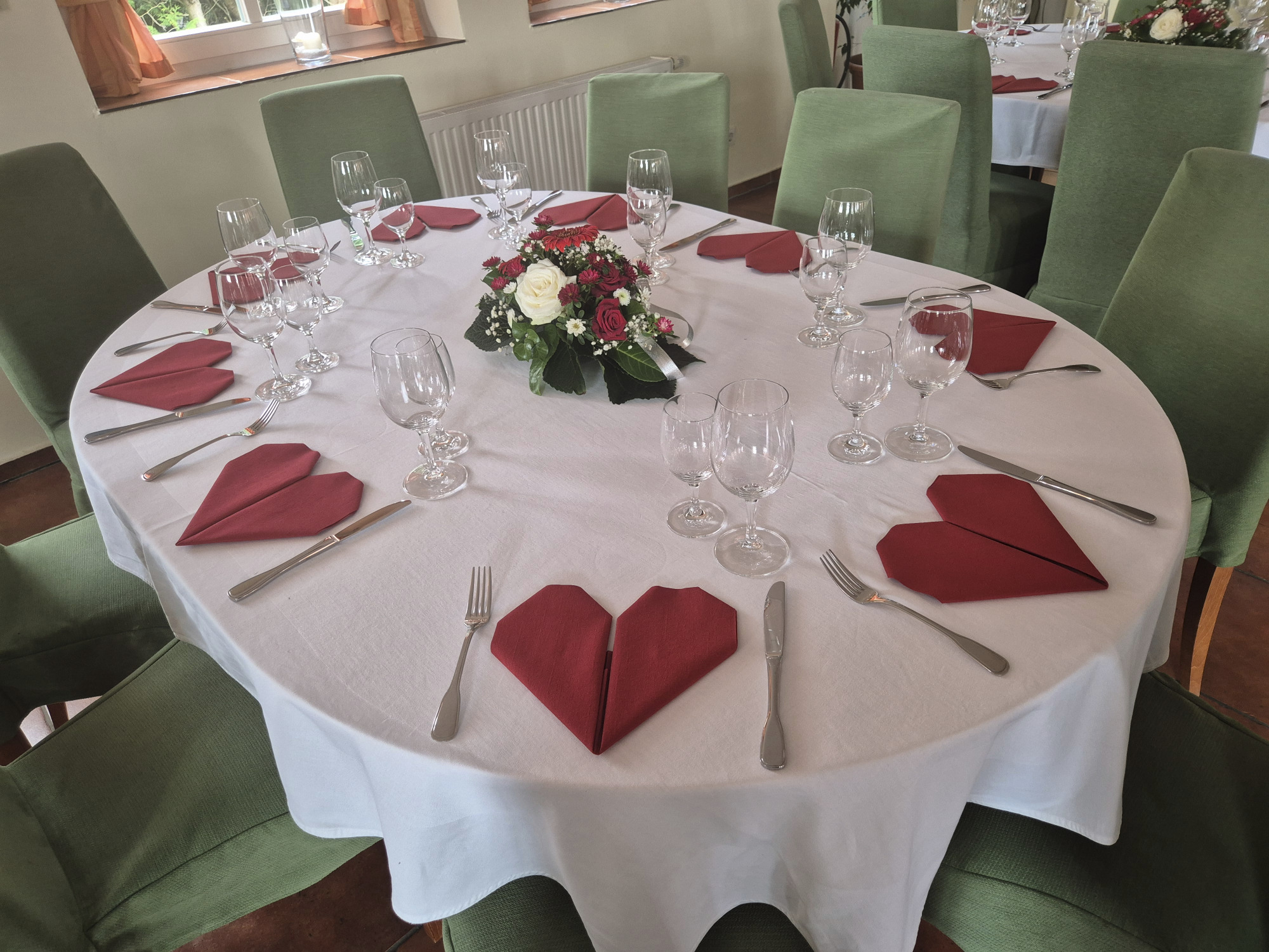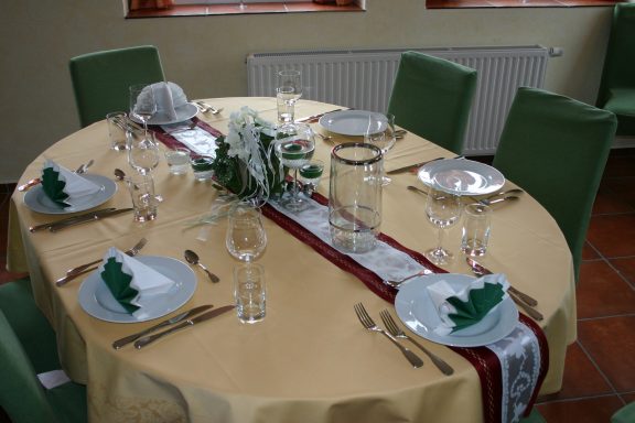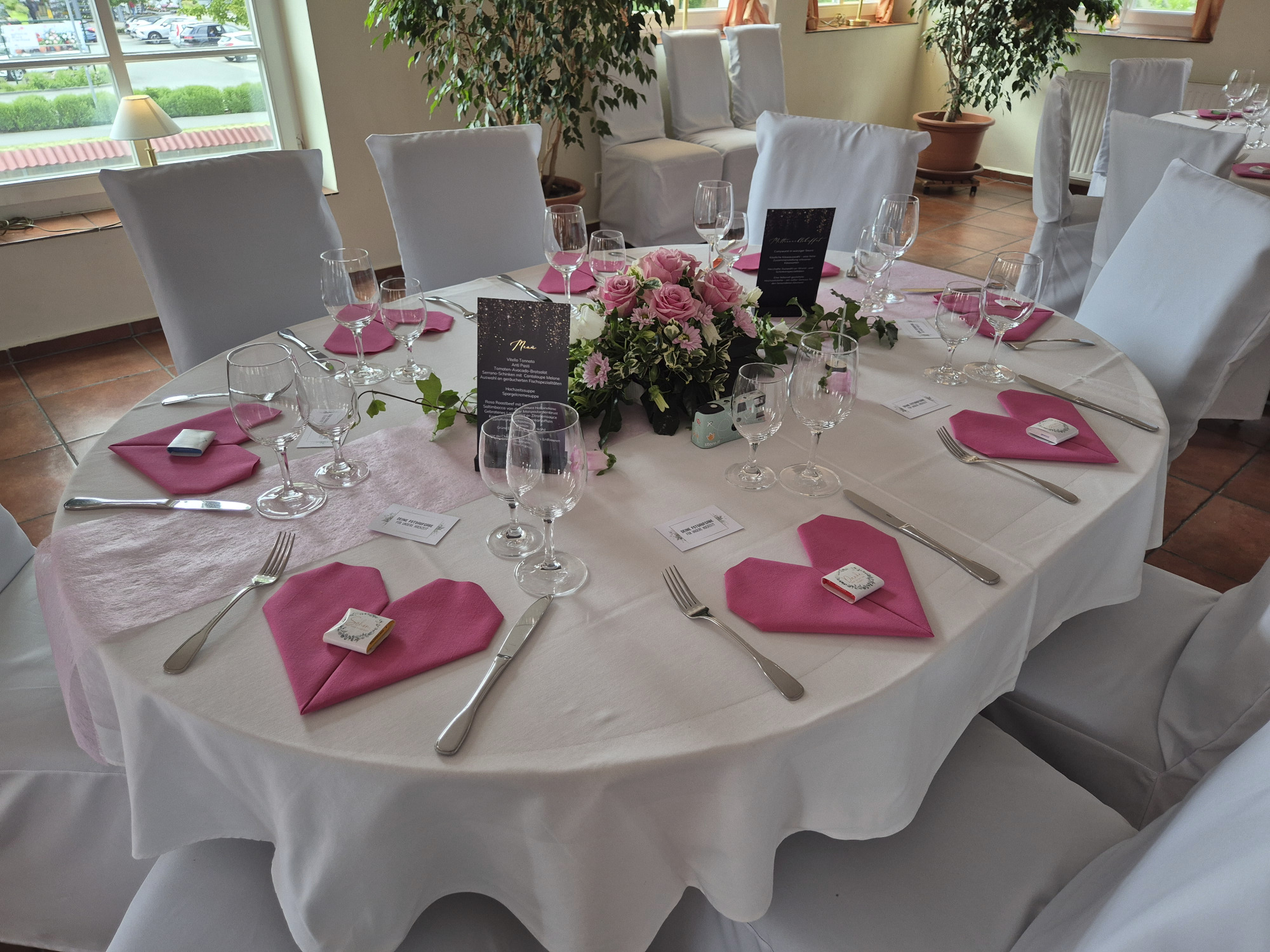 Hier finden Ihre Gäste an festlich dekorierten Tischen Platz. Farben und Gestaltung stimmen wir gerne individuell auf Ihre Wünsche ab. Auch besondere Ideen sind willkommen.