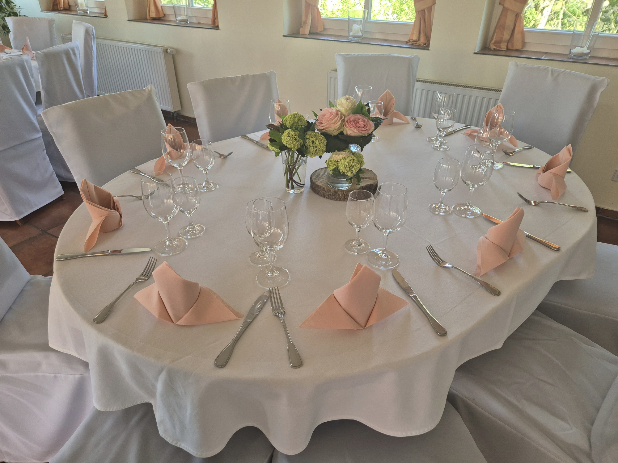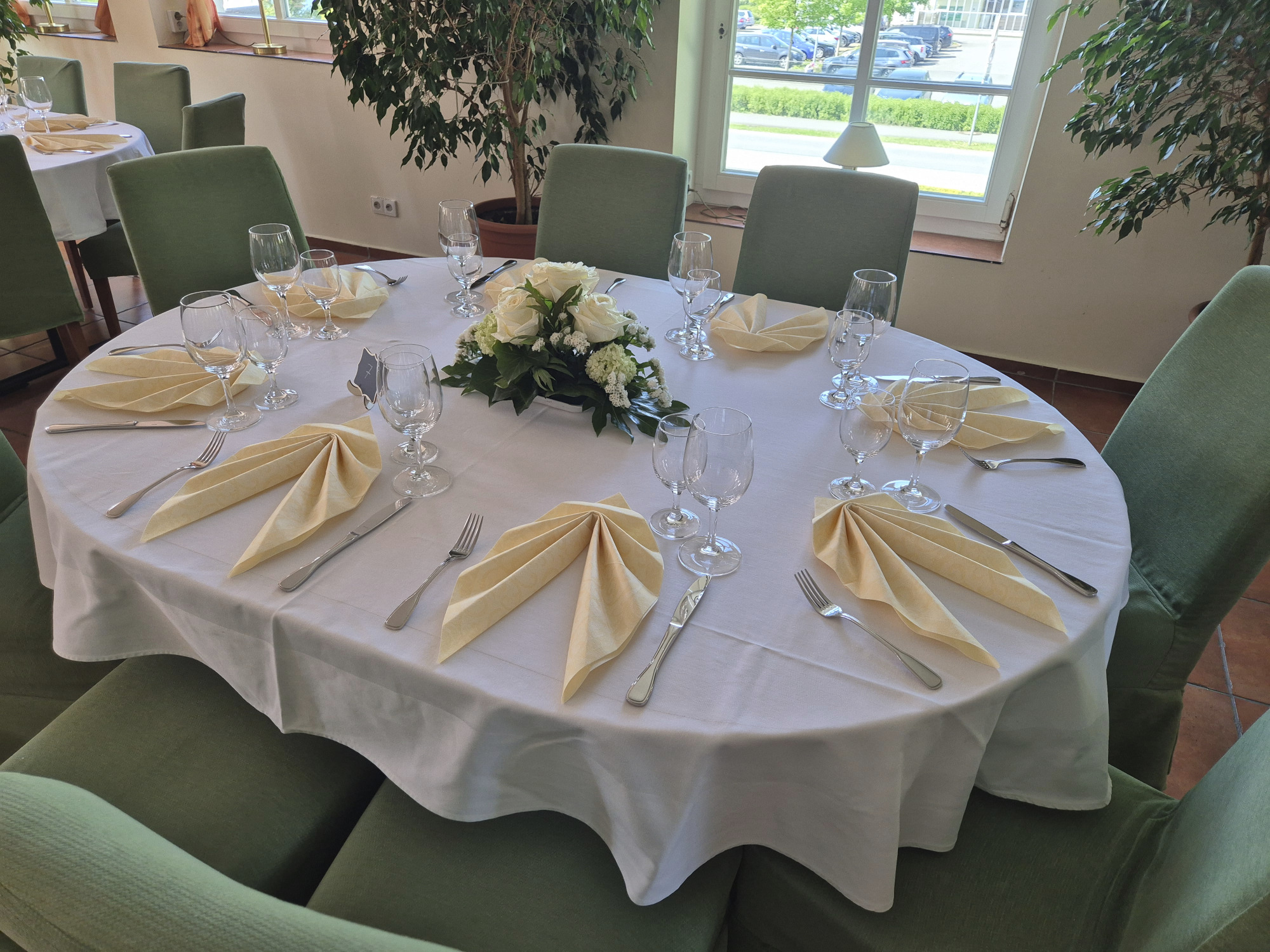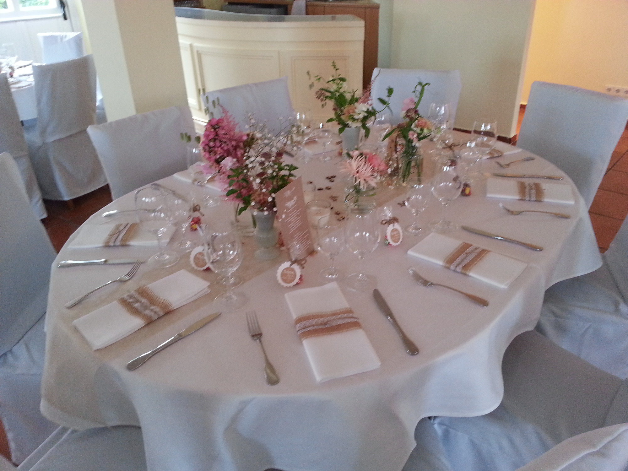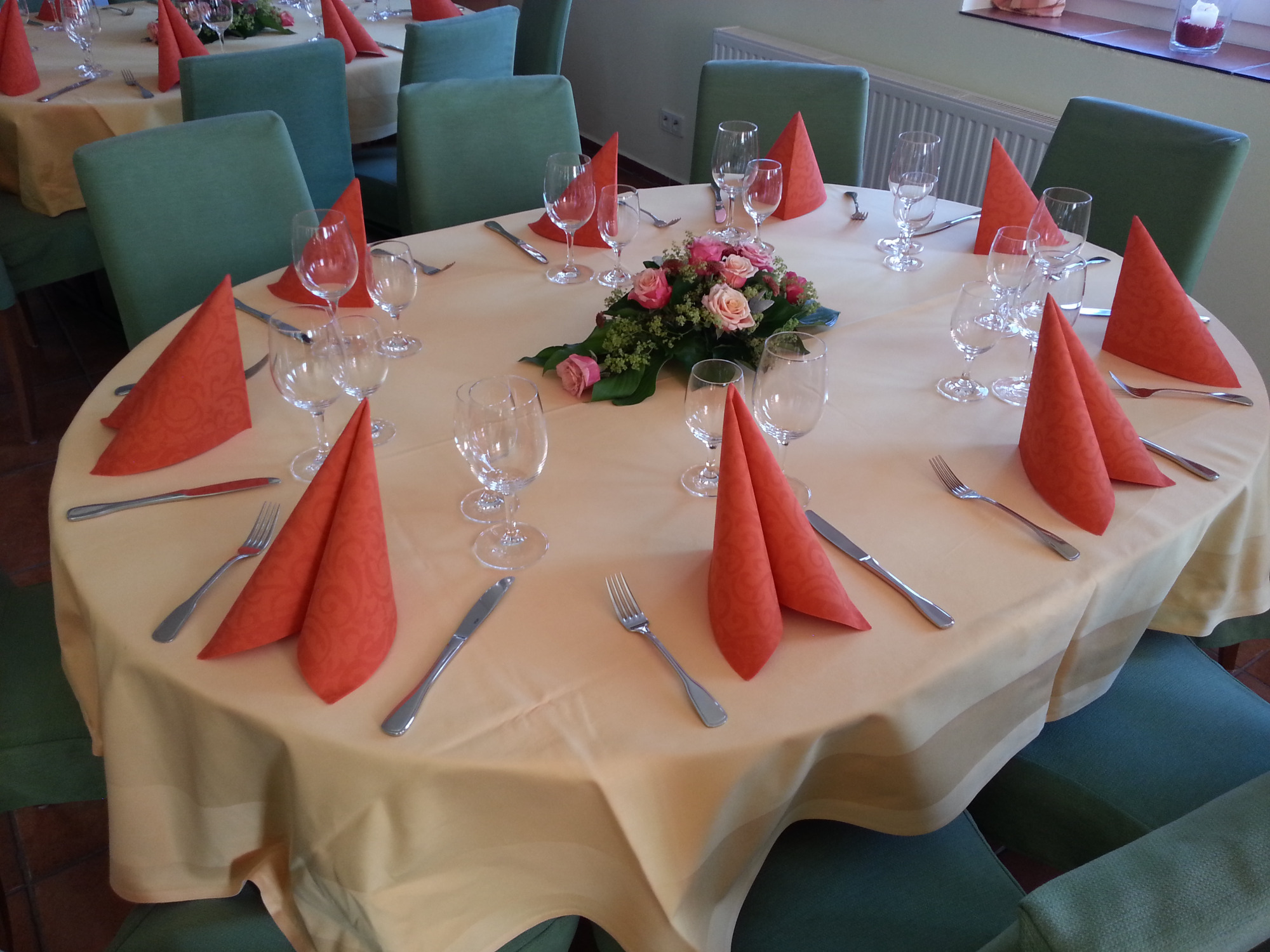 Hier finden Ihre Gäste an festlich dekorierten Tischen Platz. Farben und Gestaltung stimmen wir gerne individuell auf Ihre Wünsche ab. Auch besondere Ideen sind willkommen.