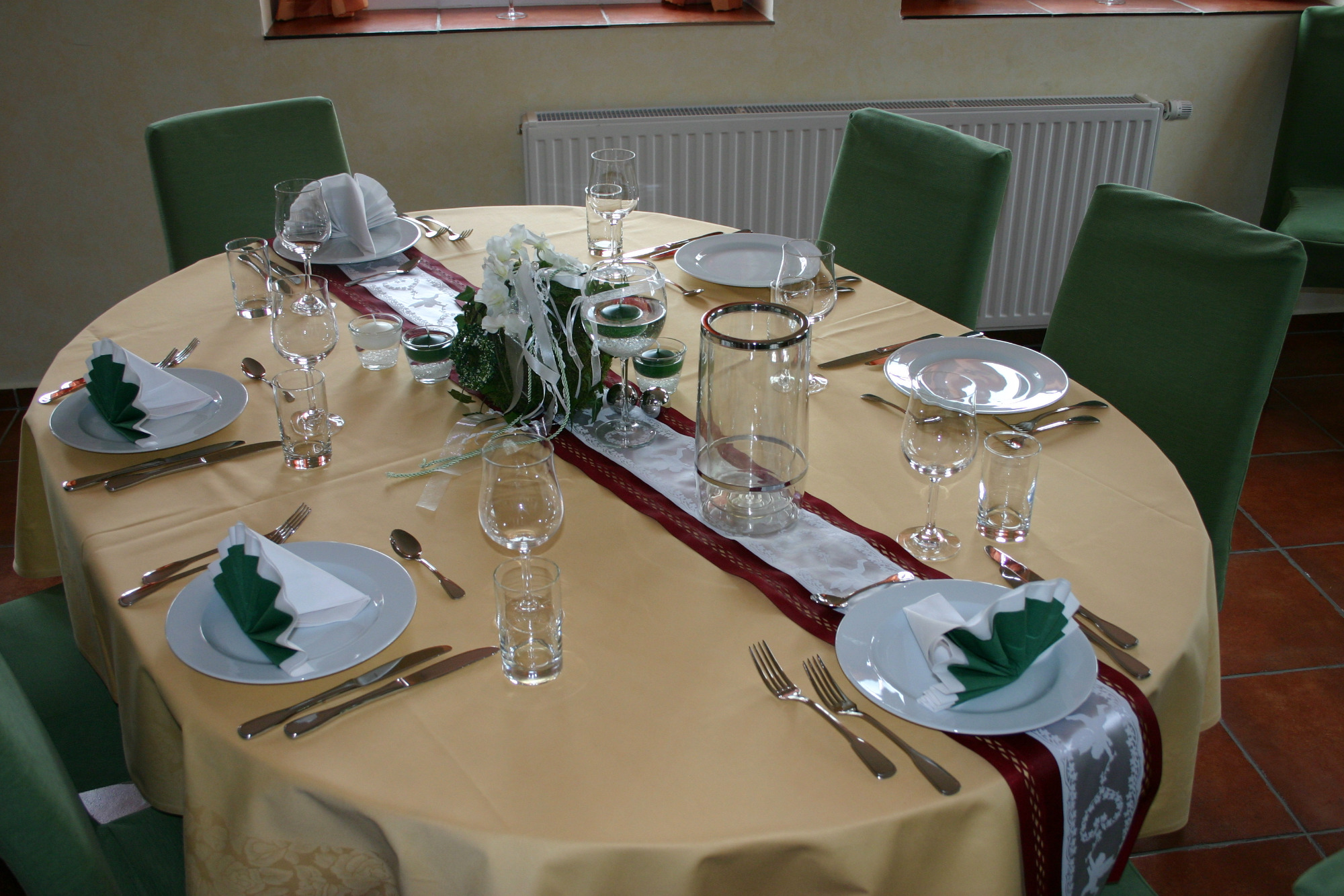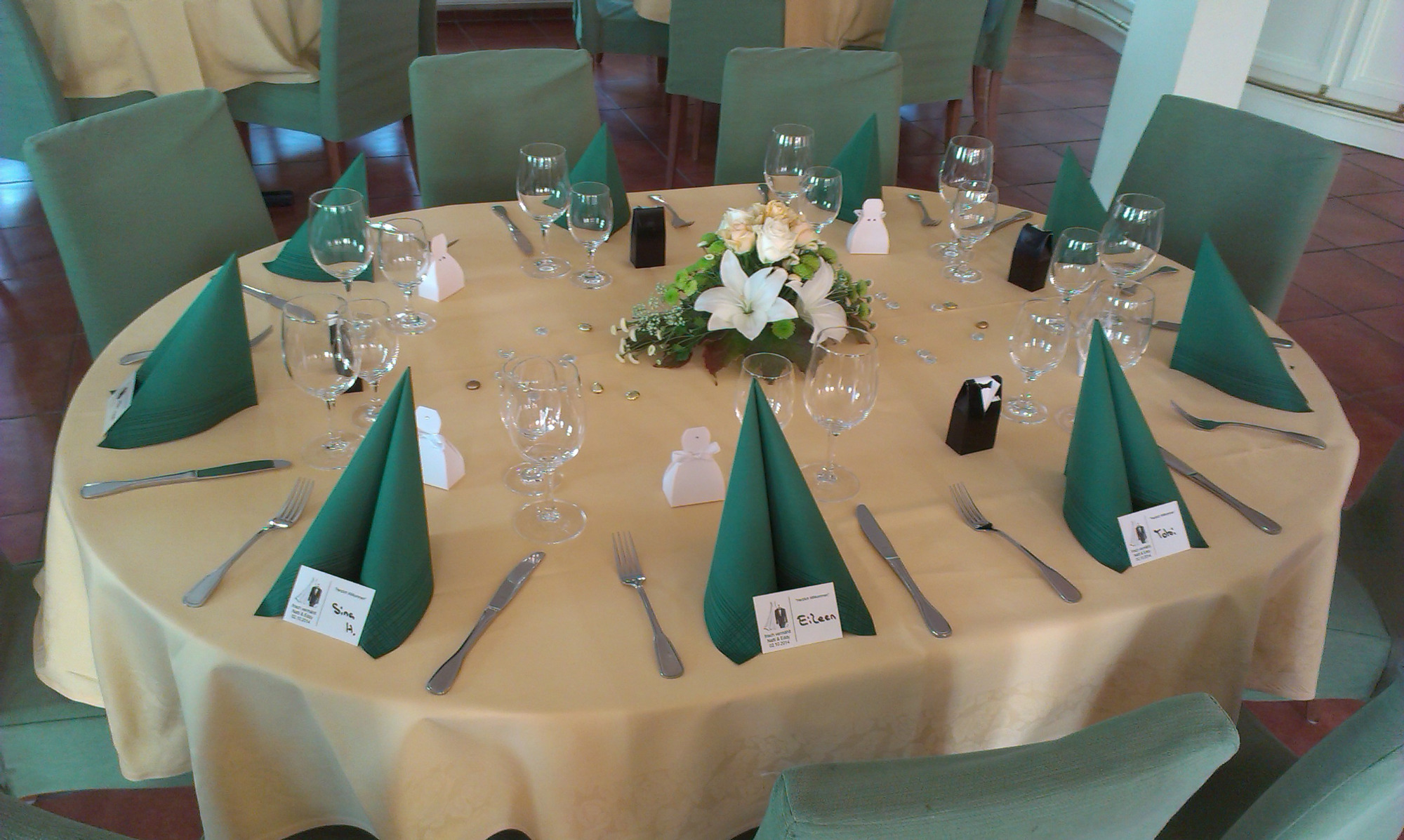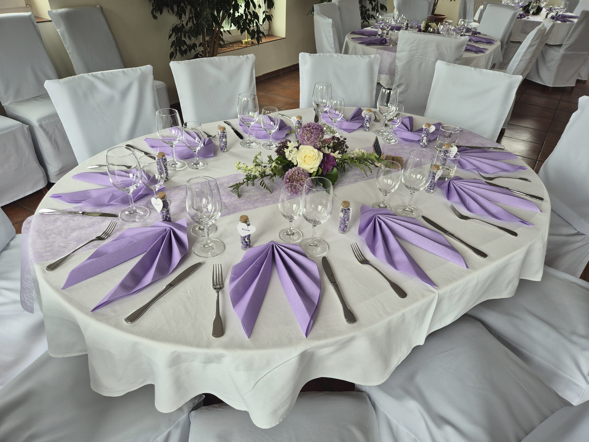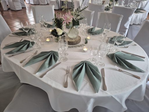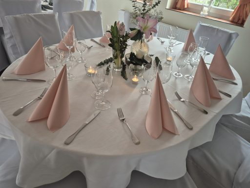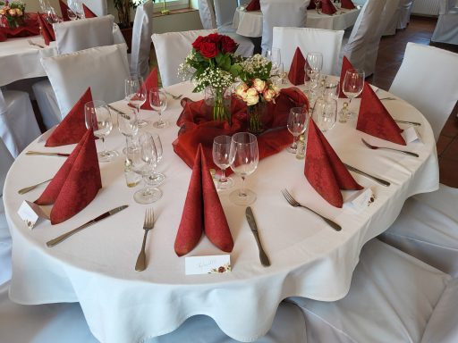 Hier zeigen wir Ihnen eine Auswahl möglicher Tischdekorationen. Gestaltung und Farbwahl lassen sich individuell anpassen. Gerne beraten wir Sie persönlich. In der Regel sind Tischdecken, Servietten und Blumen im Gesamtpreis enthalten.